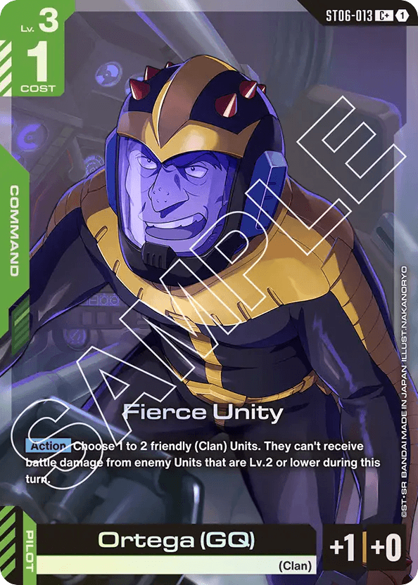 - [Action] Choose 1 to 2 friendly (Clan) Units. They can't receive battle damage from enemy Units that are Lv.2 or lower during this turn. — [Pilot] [Ortega (GQ)]