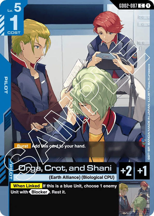 - [Burst] Add this card to your hand. — [When Linked] If this is a blue Unit, choose 1 enemy Unit with <Blocker>. Rest it.