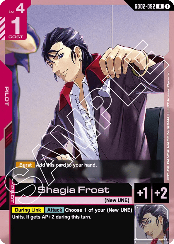- [Burst] Add this card to your hand. — [During Link] [Attack] Choose 1 of your (New UNE) Units. It gets AP+2 during this turn.