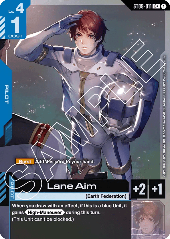 - [Burst] Add this card to your hand. — When you draw with an effect, if this is a blue Unit, it gains <High-Maneuver> during this turn. (This Unit can' t be blocked.)