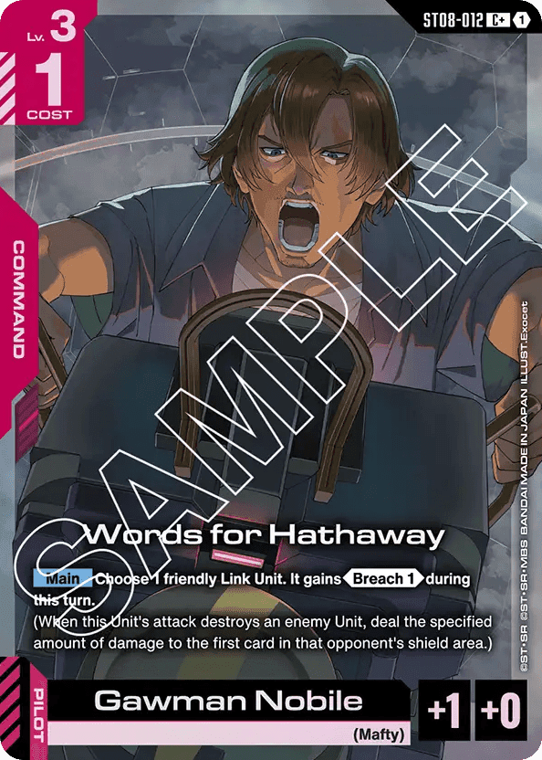 - [Main] Choose 1 friendly Link Unit. It gains <Breach 1> during this turn. (When this Unit' s attack destroys an enemy Unit, deal the specified amount of damage to the first card in that opponent' s shield area.) — [Pilot] [Gawman Nobile]