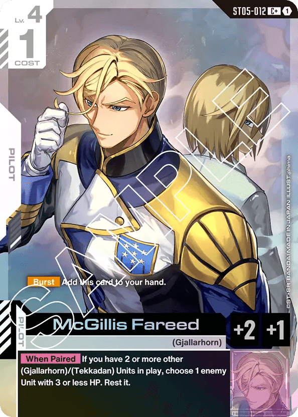 - [Burst] Add this card to your hand. — [When Paired] If you have 2 or more other (Gjallarhorn)/(Tekkadan) Units in play, choose 1 enemy Unit with 3 or less HP. Rest it.