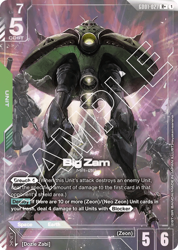 - <Breach 4> (When this Unit's attack destroys an enemy Unit, deal the specified amount of damage to the first card in that opponent's shield area.) — [Deploy] If there are 10 or more (Zeon)/(Neo Zeon) Unit cards in your trash, deal 4 damage to all Units with <Blocker>.