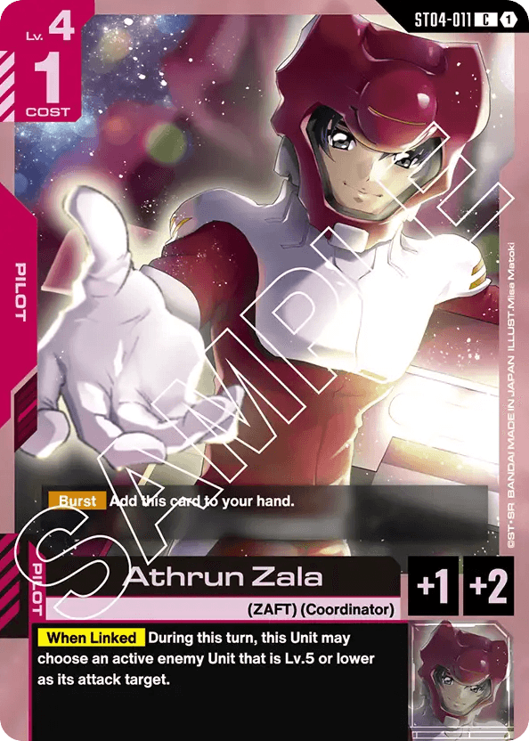 - [Burst] Add this card to your hand. — [When Linked] During this turn, this Unit may choose an active enemy Unit that is Lv.5 or lower as its attack target.