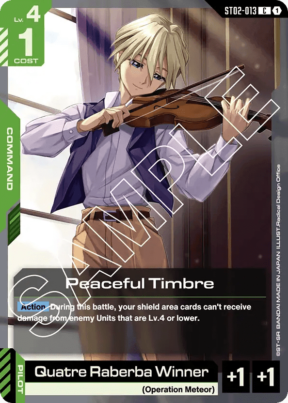- [Action] During this battle, your shield area cards can't receive damage from enemy Units that are Lv.4 or lower. — [Pilot] [Quatre Raberba Winner]