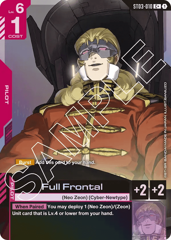 - [Burst] Add this card to your hand. — [When Paired] You may deploy 1 (Neo Zeon)/(Zeon) Unit card that is Lv.4 or lower from your hand.