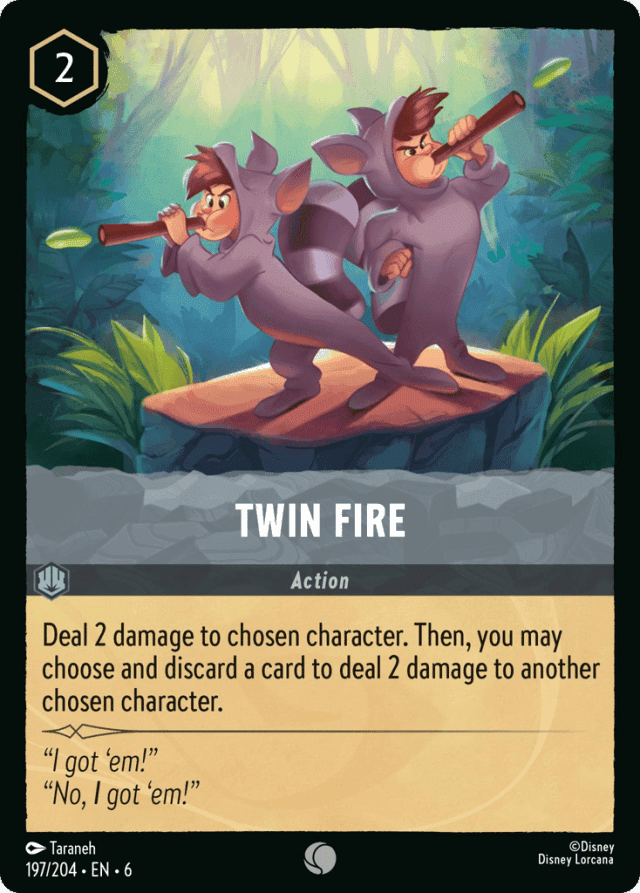 Deal 2 damage to chosen character. Then, you may choose and discard a card to deal 2 damage to another chosen character.
