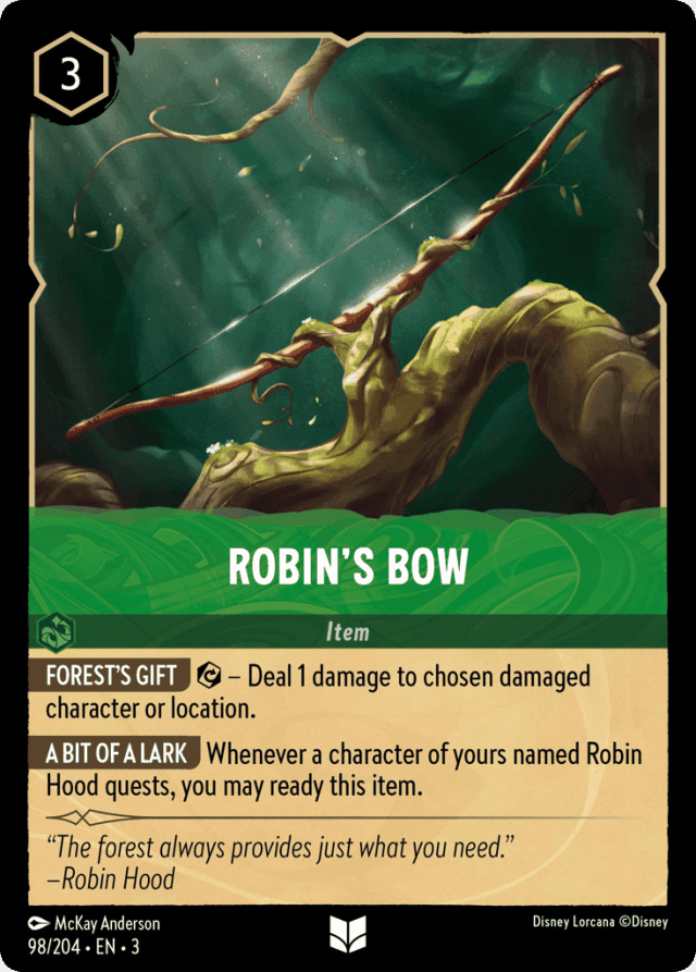 Whenever a character of yours named Robin Hood quests, you may ready this item.