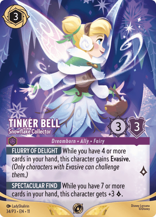 While you have 4 or more cards in your hand, this character gains Evasive. (Only characters with Evasive can challenge them.)