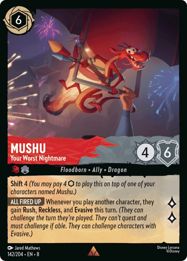 Whenever you play another character, they gain Rush, Reckless, and Evasive this turn. (They can challenge the turn they're played. They can't quest and must challenge if able. They can challenge characters with Evasive.)