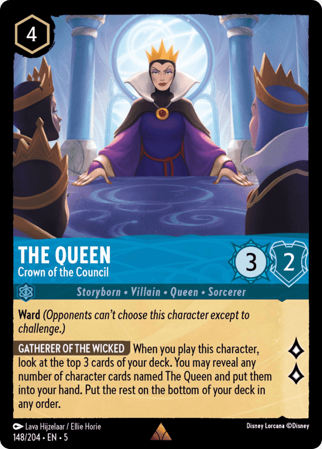 When you play this character, look at the top 3 cards of your deck. You may reveal any number of character cards named The Queen and put them into your hand. Put the rest on the bottom of your deck in any order.