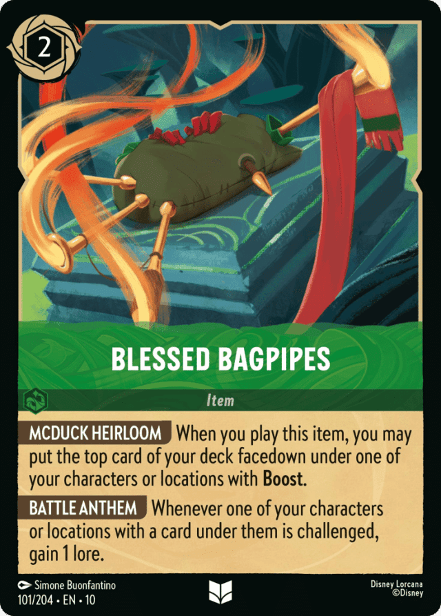 Whenever one of your characters or locations with a card under them is challenged, gain 1 lore.