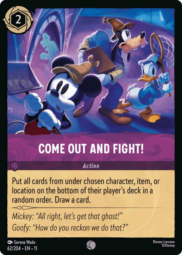 Put all cards from under chosen character, item, or location on the bottom of their player's deck in a random order. Draw a card.