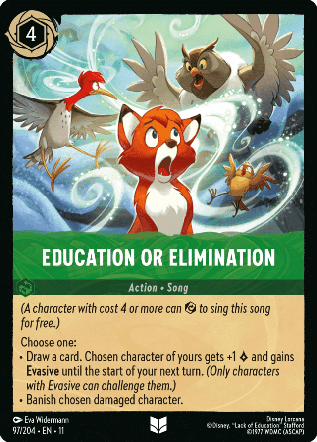 (A character with cost 4 or more can {Exert} to sing this song for free.) Choose one: • Draw a card. Chosen character of yours gets +1 {Lore} and gains Evasive until the start of your next turn. (Only characters with Evasive can challenge them.) • Banish chosen damaged character.