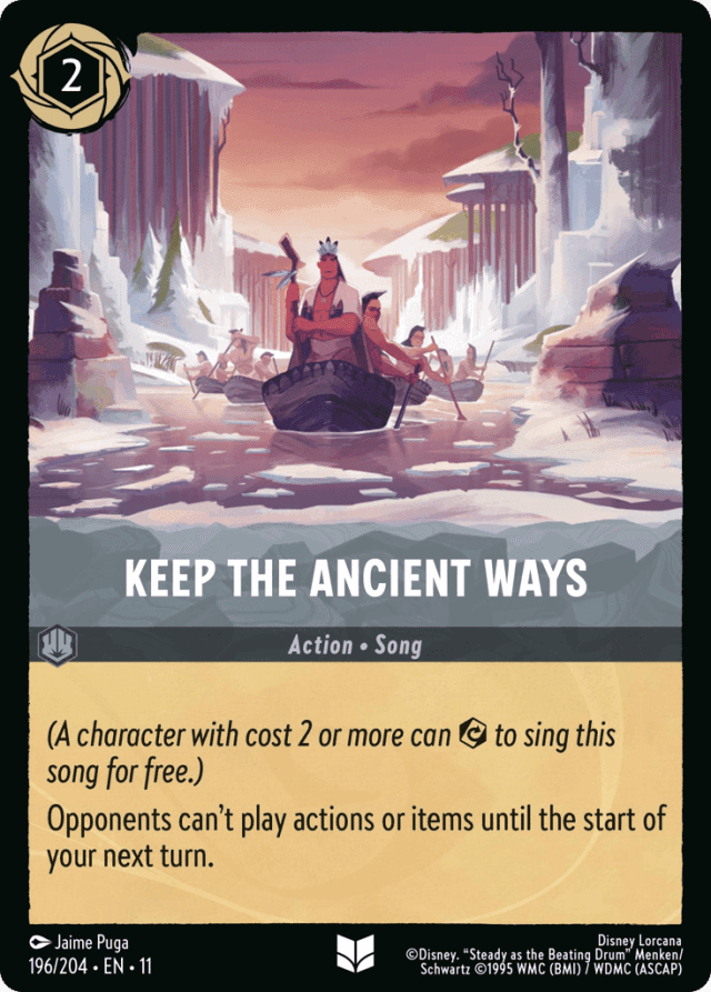 (A character with cost 2 or more can {Exert} to sing this song for free.) Opponents can't play actions or items until the start of your next turn.