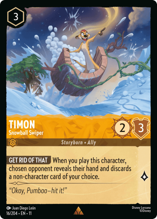 When you play this character, chosen opponent reveals their hand and discards a non-character card of your choice.