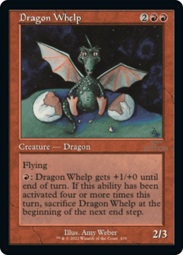 If the fourth (or more) time Dragon Whelp's ability is activated during the same turn happens to be during that turn's end step, the delayed triggered ability won't trigger until the beginning of the next turn's end step. You'll have to sacrifice Dragon Whelp at that time. — The first three times Dragon Whelp's ability is activated in a turn will do nothing other than give it +1/+0 until end of turn. Any subsequent activations will also cause its delayed triggered ability to trigger. That means if you activate Dragon Whelp's ability five times, for example, two different delayed triggered abilities will trigger at the beginning of the next end step and cause you to sacrifice Dragon Whelp. — If the fourth (or subsequent) time Dragon Whelp's ability is activated during the same turn is during that turn's end step, the delayed triggered ability won't trigger until the beginning of the next turn's end step. You'll have to sacrifice Dragon Whelp at that time. — There's no limit to the number of times you can activate Dragon Whelp's ability in a turn. However, the fourth activation in a turn and each subsequent activation will cause a delayed triggered ability that will force you to sacrifice Dragon Whelp at the beginning of the next end step.