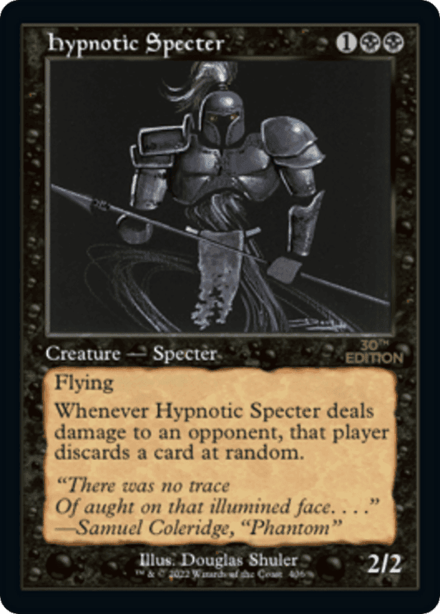 Flying Whenever this creature deals damage to an opponent, that player discards a card at random.