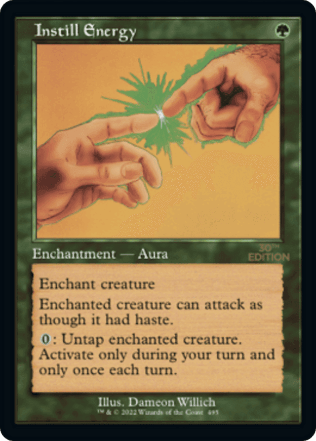 If attached to an opponent's creature, you can untap their creature during your turn. — Instill Energy's untap ability will not untap the creature until it resolves. This means other spells and abilities can be used before it actually becomes untapped. — Any Auras (or other effects) which are on the creature that would cause it to not be untapped (or have a cost to be untapped) during untap step do not in any way hinder or imply a cost to use this card's ability to untap once during the turn.