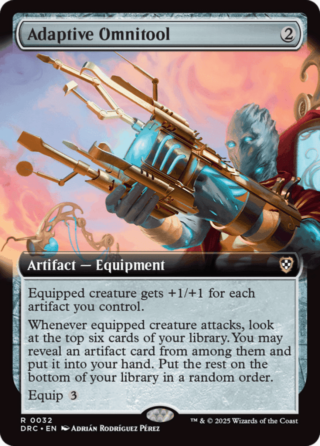 Equipped creature gets +1/+1 for each artifact you control. Whenever equipped creature attacks, look at the top six cards of your library. You may reveal an artifact card from among them and put it into your hand. Put the rest on the bottom of your library in a random order. Equip {3}