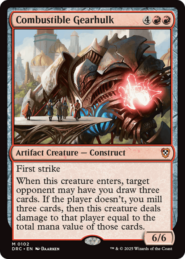 If any of the cards put into your graveyard have {X} in their mana cost, X is considered to be 0. — If you have fewer than three cards in your library, the opponent may choose to have you draw three cards. If so, you'll lose the game as state-based actions are performed. — While Combustible Gearhulk's triggered ability is resolving, no player may take any actions other than those specified by the Gearhulk. Once the opponent makes a choice, players can't cast spells or activate abilities until after the cards are drawn or put into the graveyard and damage has been dealt (if applicable).