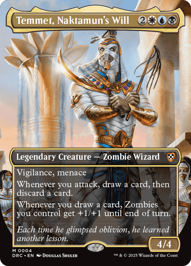 Vigilance, menace Whenever you attack, draw a card, then discard a card. Whenever you draw a card, Zombies you control get +1/+1 until end of turn.
