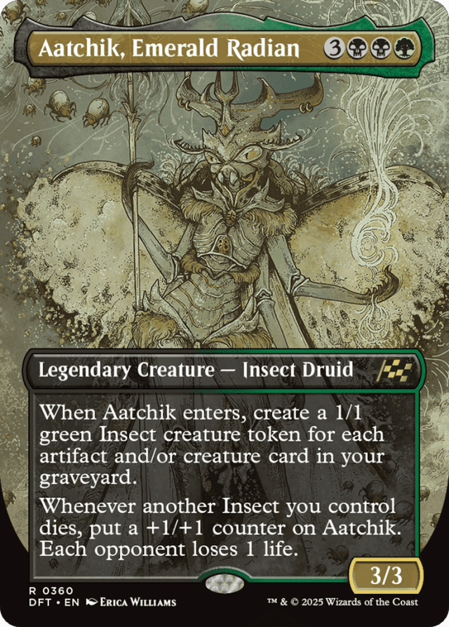 When Aatchik enters, create a 1/1 green Insect creature token for each artifact and/or creature card in your graveyard. Whenever another Insect you control dies, put a +1/+1 counter on Aatchik. Each opponent loses 1 life.