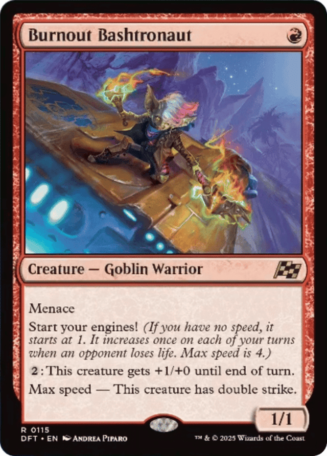 Menace Start your engines! (If you have no speed, it starts at 1. It increases once on each of your turns when an opponent loses life. Max speed is 4.) {2}: This creature gets +1/+0 until end of turn. Max speed — This creature has double strike.