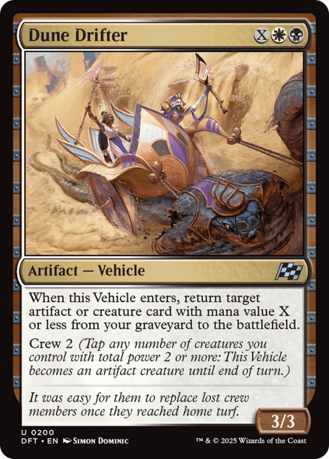 When this Vehicle enters, return target artifact or creature card with mana value X or less from your graveyard to the battlefield. Crew 2 (Tap any number of creatures you control with total power 2 or more: This Vehicle becomes an artifact creature until end of turn.)