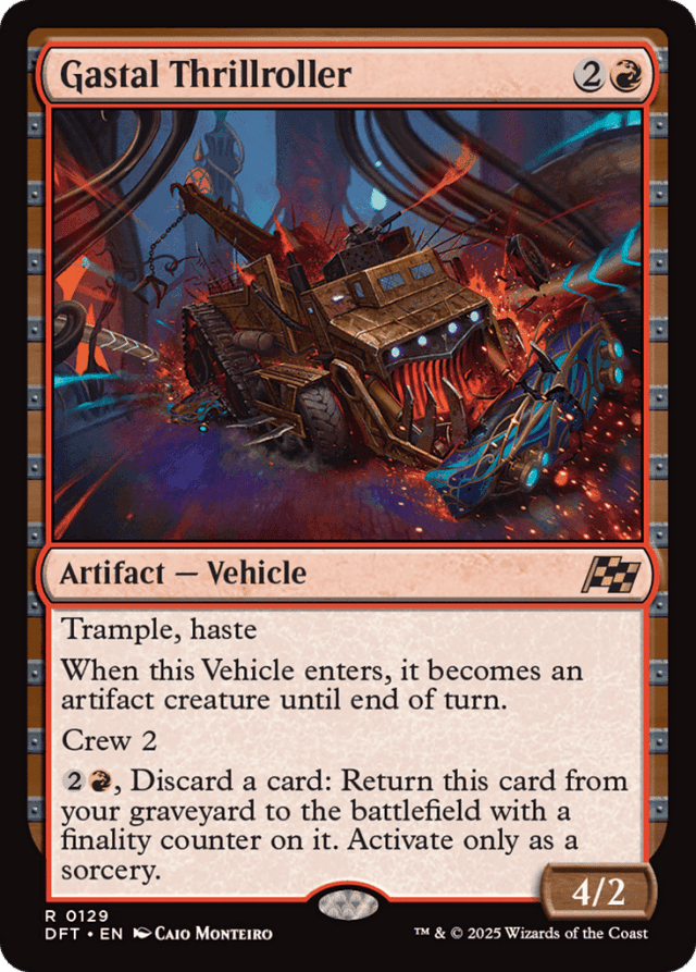 Trample, haste When this Vehicle enters, it becomes an artifact creature until end of turn. Crew 2 {2}{R}, Discard a card: Return this card from your graveyard to the battlefield with a finality counter on it. Activate only as a sorcery.