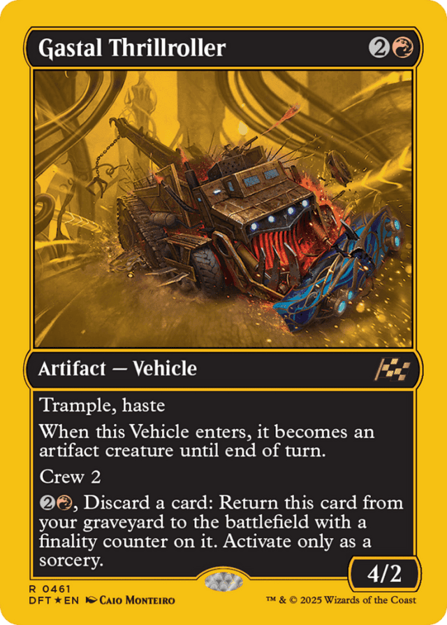 Trample, haste When this Vehicle enters, it becomes an artifact creature until end of turn. Crew 2 {2}{R}, Discard a card: Return this card from your graveyard to the battlefield with a finality counter on it. Activate only as a sorcery.