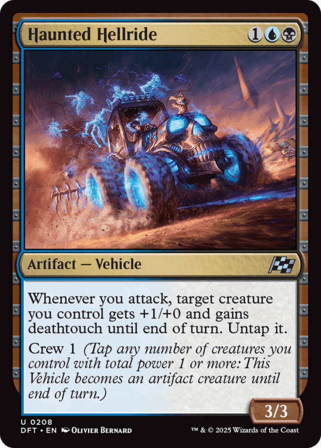 Whenever you attack, target creature you control gets +1/+0 and gains deathtouch until end of turn. Untap it. Crew 1 (Tap any number of creatures you control with total power 1 or more: This Vehicle becomes an artifact creature until end of turn.)