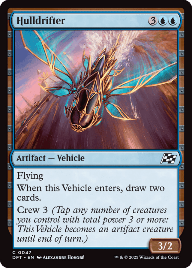 Flying When this Vehicle enters, draw two cards. Crew 3 (Tap any number of creatures you control with total power 3 or more: This Vehicle becomes an artifact creature until end of turn.)
