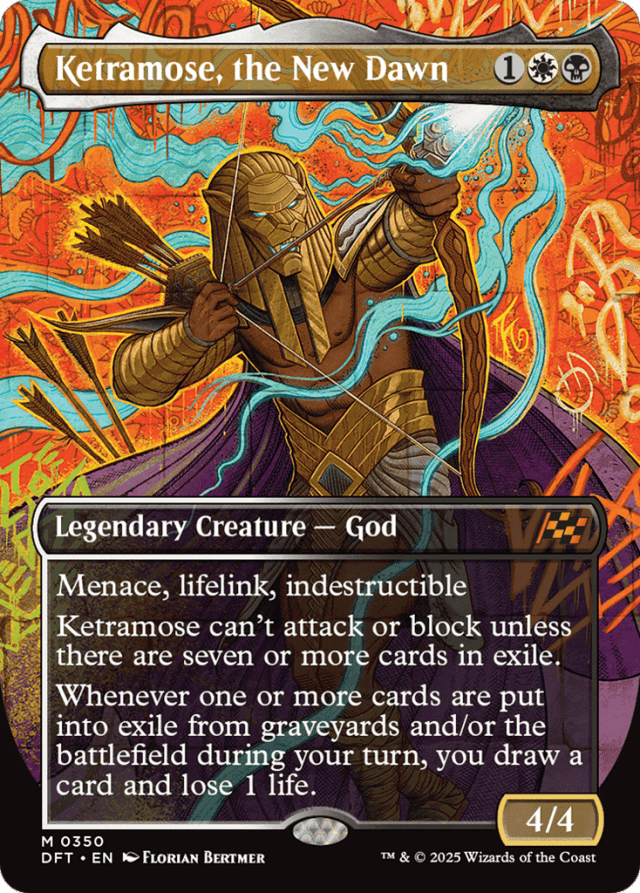Menace, lifelink, indestructible Ketramose can't attack or block unless there are seven or more cards in exile. Whenever one or more cards are put into exile from graveyards and/or the battlefield during your turn, you draw a card and lose 1 life.