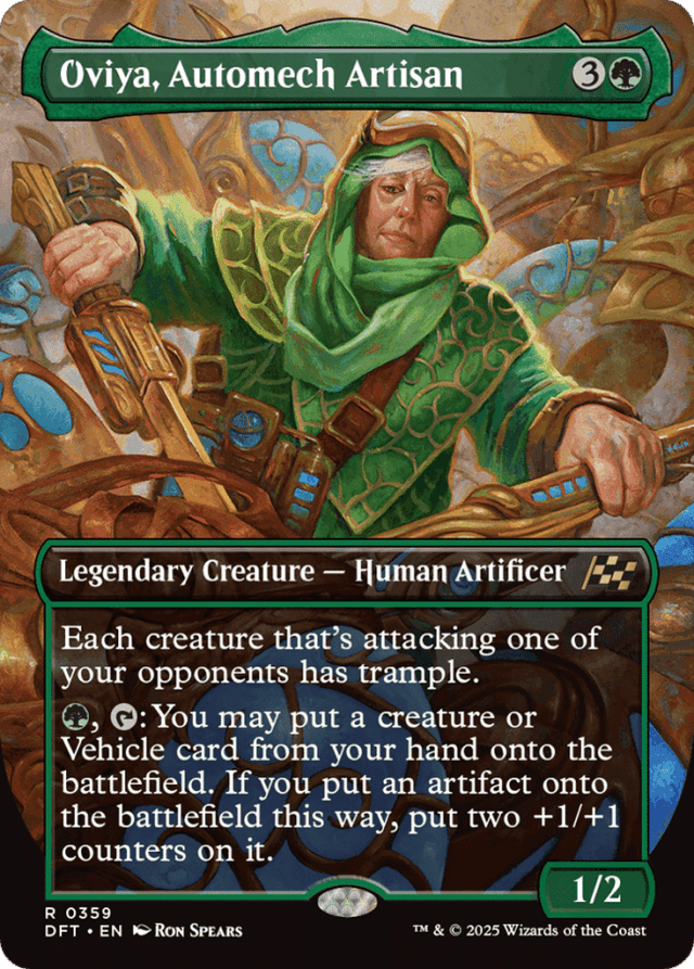 Each creature that's attacking one of your opponents has trample. {G}, {T}: You may put a creature or Vehicle card from your hand onto the battlefield. If you put an artifact onto the battlefield this way, put two +1/+1 counters on it.