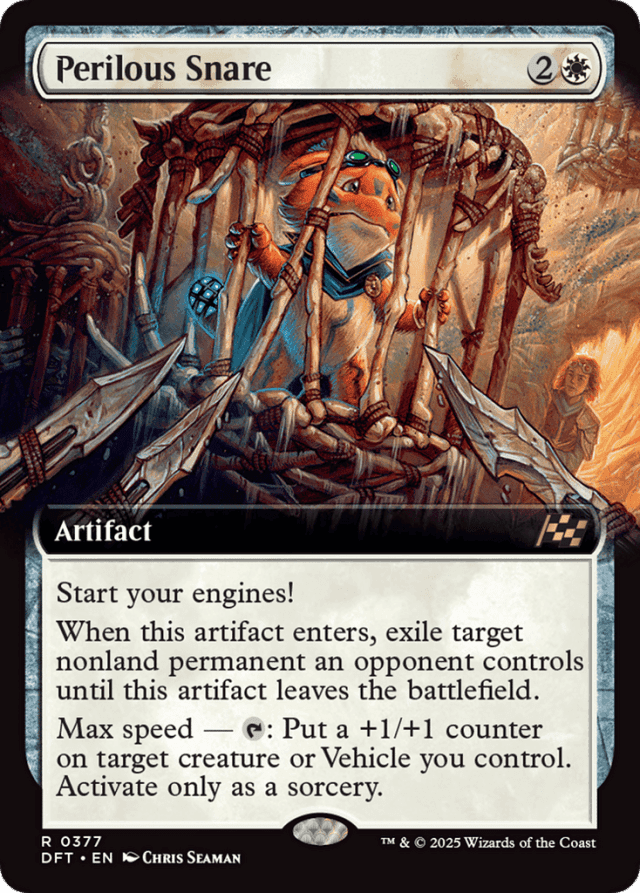 Start your engines! (If you have no speed, it starts at 1. It increases once on each of your turns when an opponent loses life. Max speed is 4.) When this artifact enters, exile target nonland permanent an opponent controls until this artifact leaves the battlefield. Max speed — {T}: Put a +1/+1 counter on target creature or Vehicle you control. Activate only as a sorcery.