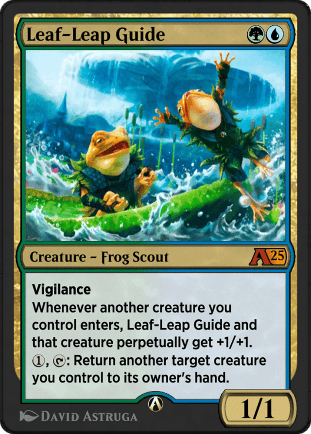 Vigilance Whenever another creature you control enters, Leaf-Leap Guide and that creature perpetually get +1/+1. {1}, {T}: Return another target creature you control to its owner's hand.
