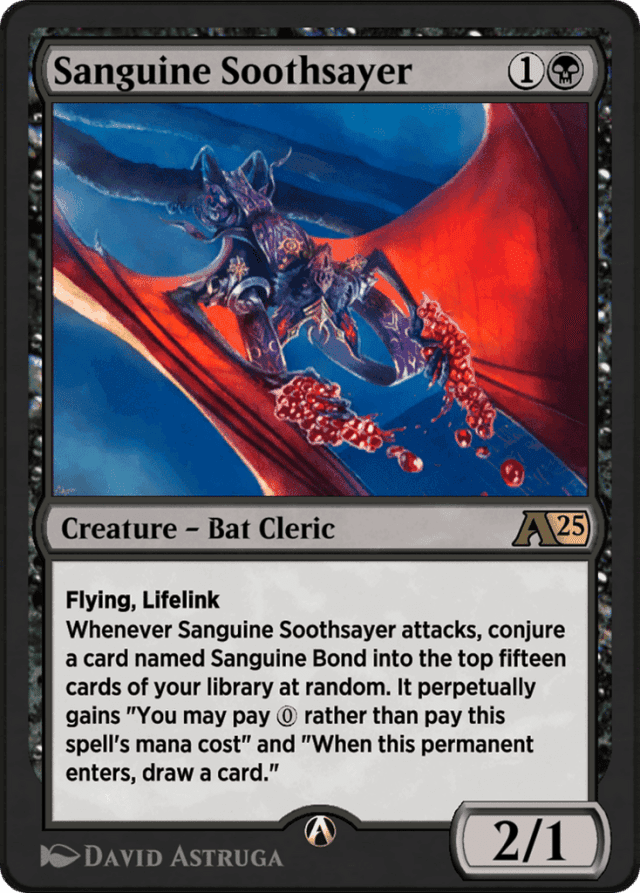 Flying, lifelink Whenever Sanguine Soothsayer attacks, conjure a card named Sanguine Bond into the top fifteen cards of your library at random. It perpetually gains "You may pay {0} rather than pay this spell's mana cost" and "When this permanent enters, draw a card."