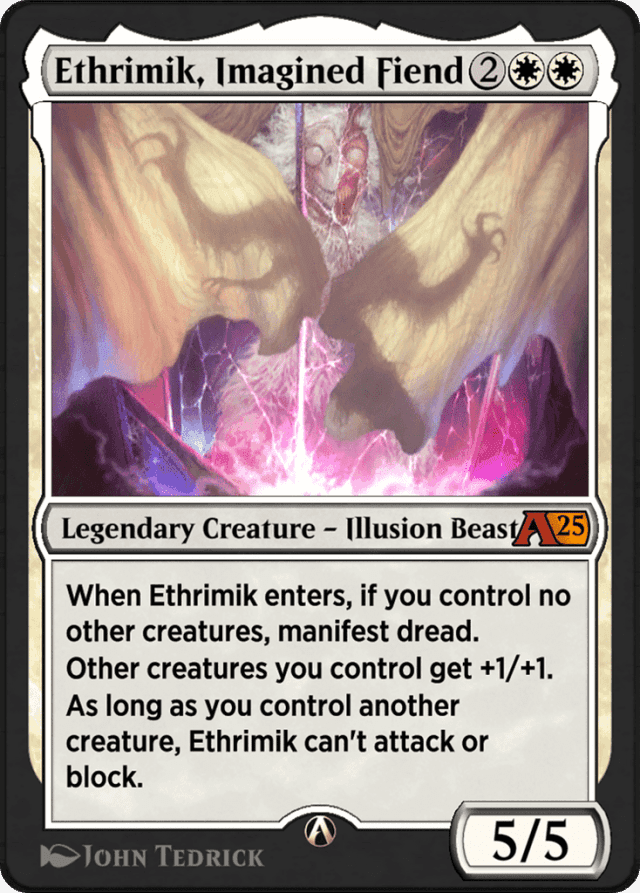 When Ethrimik enters, manifest dread. Other creatures you control get +1/+1. As long as you control another creature, Ethrimik can't attack or block.