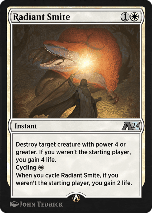 Destroy target creature with power 4 or greater. If you weren't the starting player, you gain 4 life. Cycling {W} When you cycle Radiant Smite, if you weren't the starting player, you gain 2 life.