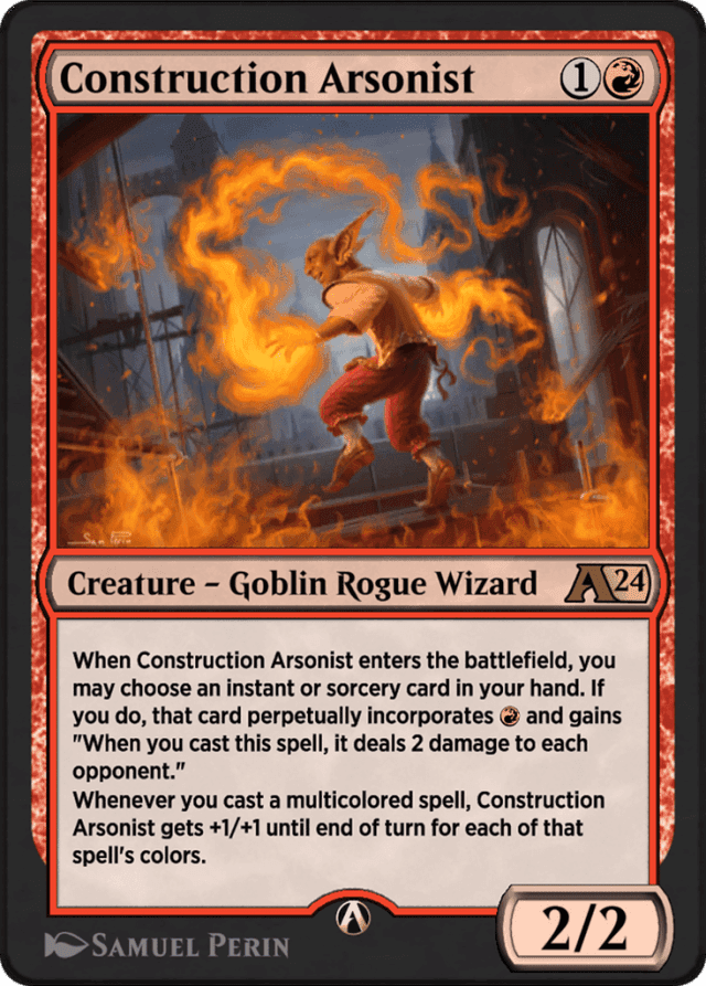 When Construction Arsonist enters, you may choose an instant or sorcery card in your hand. If you do, that card perpetually incorporates {R} and gains "When you cast this spell, it deals 2 damage to each opponent." Whenever you cast a multicolored spell, Construction Arsonist gets +1/+1 until end of turn for each of that spell's colors.