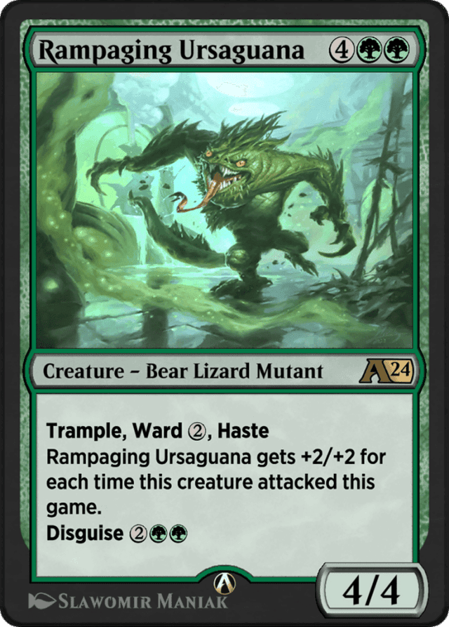 Trample, ward {2}, haste Rampaging Ursaguana gets +2/+2 for each time this creature attacked this game. Disguise {2}{G}{G}