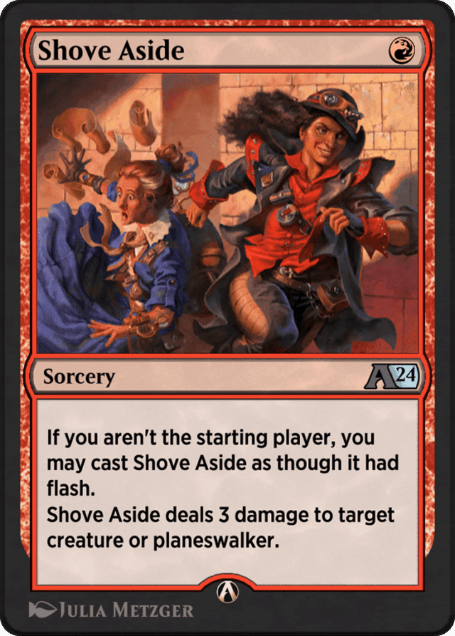 If you aren't the starting player, you may cast Shove Aside as though it had flash. Shove Aside deals 3 damage to target creature or planeswalker.