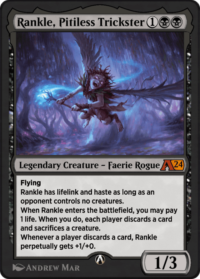 Flying Rankle has lifelink and haste as long as an opponent controls no creatures. When Rankle enters, you may pay 1 life. When you do, each player discards a card and sacrifices a creature. Whenever a player discards a card, Rankle perpetually gets +1/+0.