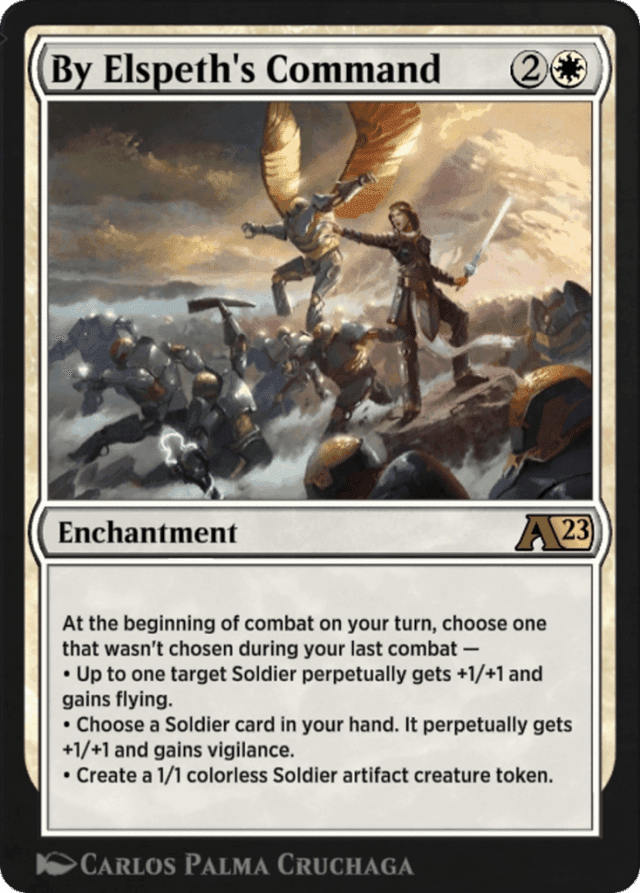At the beginning of combat on your turn, choose one that wasn't chosen during your last combat — • Up to one target Soldier perpetually gets +1/+1 and gains flying. • Choose a Soldier card in your hand. It perpetually gets +1/+1 and gains vigilance. • Create a 1/1 colorless Soldier artifact creature token.