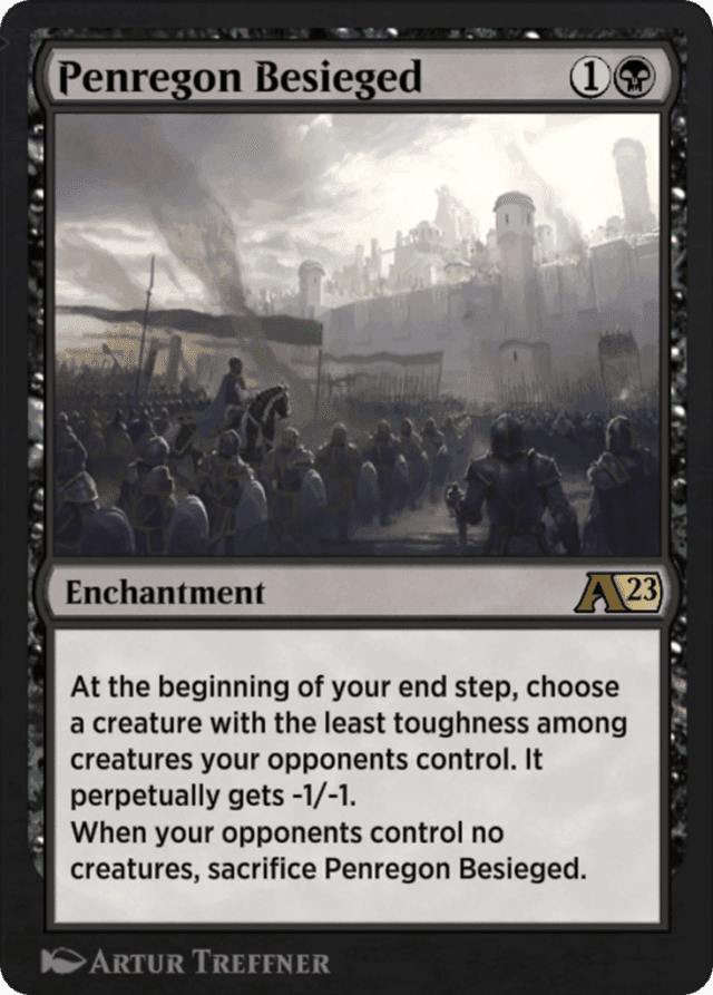 At the beginning of your end step, choose a creature with the least toughness among creatures your opponents control. It perpetually gets -1/-1. When your opponents control no creatures, sacrifice Penregon Besieged.