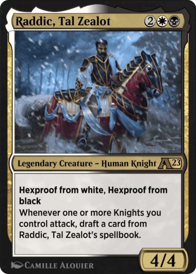 Hexproof from white and from black Whenever one or more Knights you control attack, draft a card from Raddic, Tal Zealot's spellbook.
