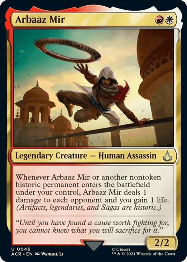 Whenever Arbaaz Mir or another nontoken historic permanent you control enters, Arbaaz Mir deals 1 damage to each opponent and you gain 1 life. (Artifacts, legendaries, and Sagas are historic.)