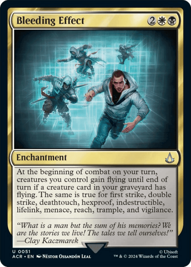 If one of the creature cards in your graveyard has one or more variants of the listed keywords (for example, hexproof from white), creatures you control gain those specific variants. — The set of creatures affected by Bleeding Effect’s ability and how they are affected is determined as the ability resolves. Creatures you begin to control later in the turn won’t gain any abilities, and the abilities gained won’t change if creature cards enter or leave your graveyard after the ability has resolved.