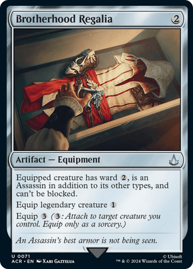 Equipped creature has ward {2}, is an Assassin in addition to its other types, and can't be blocked. Equip legendary creature {1} Equip {3} ({3}: Attach to target creature you control. Equip only as a sorcery.)